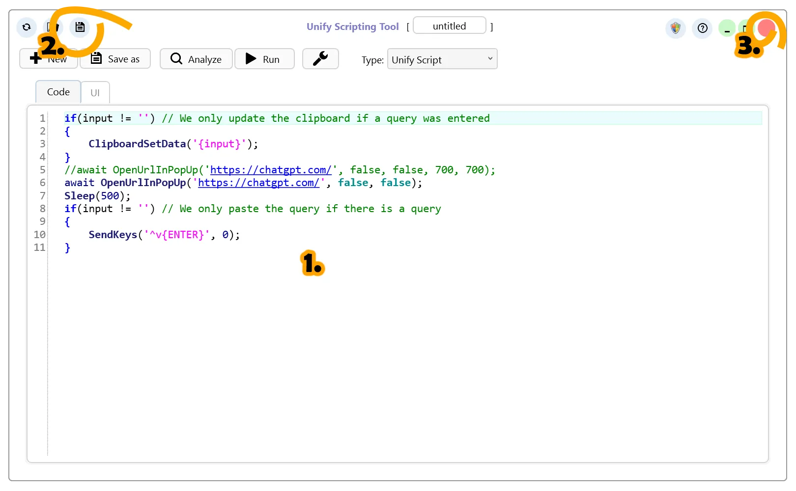 To do this, we are going to create a Unify script that opens ChatGPT website in a popup window and once the site is loaded, the script will paste the query input from the Hotkey Extender.